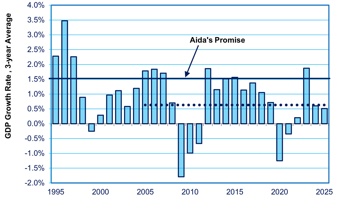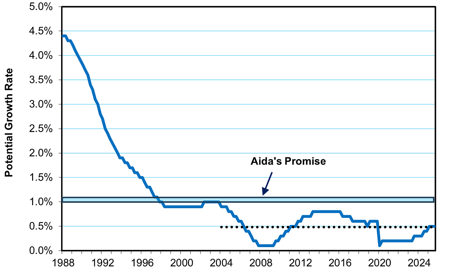 Sezvo mari zhinji yekudyara mari ichingotsiva midziyo yakasakara kana isingachashandi, mari yekudyara iyo inowedzera huwandu hwave hwave zero, ichipa chete 0.1% pagore mukukura kweGDP mumakore makumi maviri apfuura. Zvakangodaro, Aida anofanotaura kuti, nekuda kwechivimbiso chekudyara, “mwero wekukura unotarisirwa kukwira kusvika pa1%. Izvo zvakapetwa kaviri avhareji yemakore makumi maviri apfuura (ona chati iri pazasi).