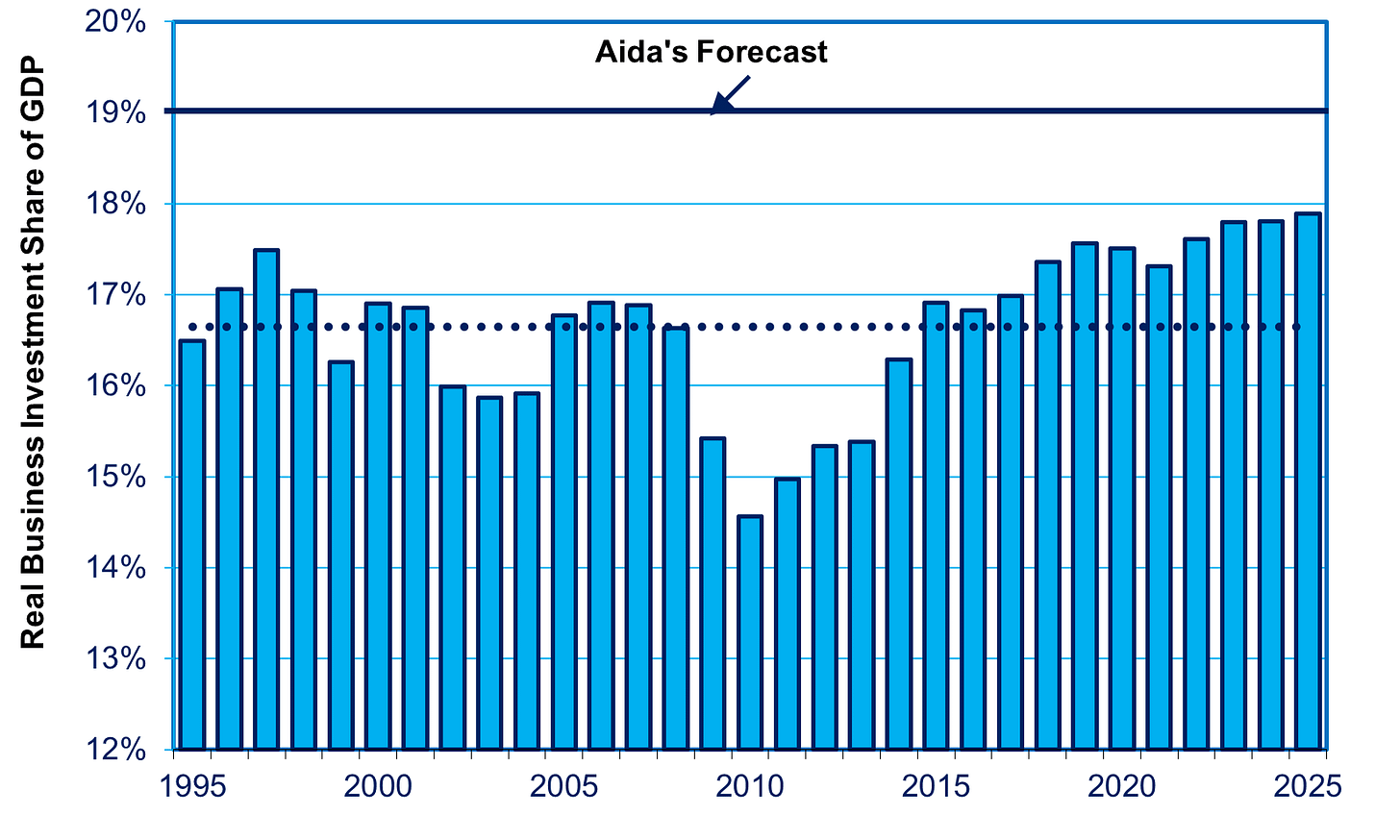 Aida anofanotaura kuti kukura kweGDP kuchakwira sezvo kurudziro yemari inobatidza kuwedzera kwekudyara kwebhizinesi. Iyo yekupedzisira icha “kure kupfuura” 18% yeGDP, inosvika padanho 2.5 muzana pamusoro peavhareji yemakore makumi matatu apfuura (ona chati iri pazasi).