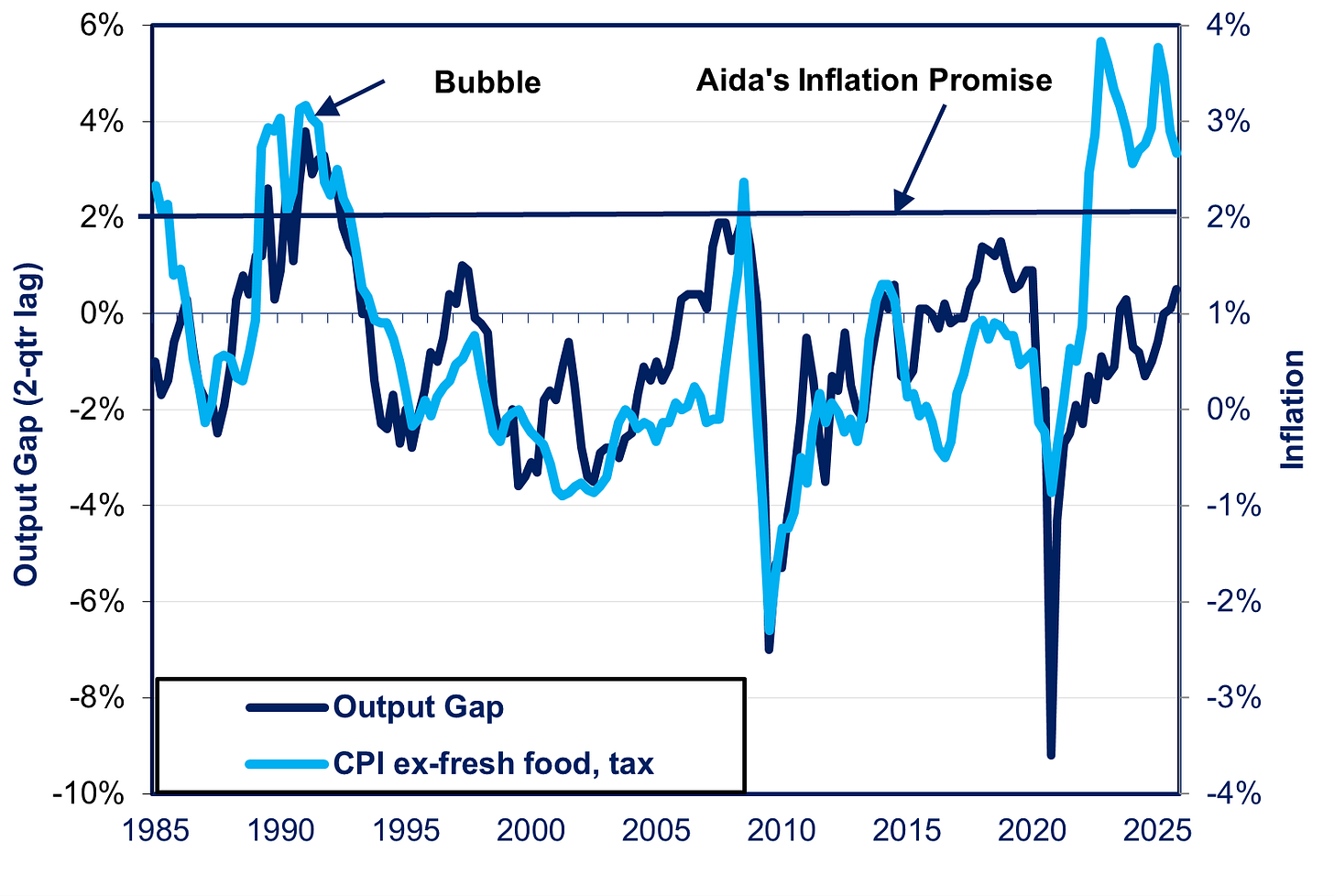 Mumamiriro ezvinhu aAida, kukwira-parutivi inflation kunopera, ukuwo inflation inotungamirwa inokwira kusvika pa2% panosvika 2027 uye inogara ipapo. Saka, mubereko wehusiku humwe wakagadzwa neBank of Japan uchakwirawo kusvika ku2% panosvika 2028. Izvozvo zvinoreva kuti “chaiyo” mwero wemhindu pamari yehusiku humwe ndizero, iyo, iye anodaro, “inosimudzira basa rezvemari.”