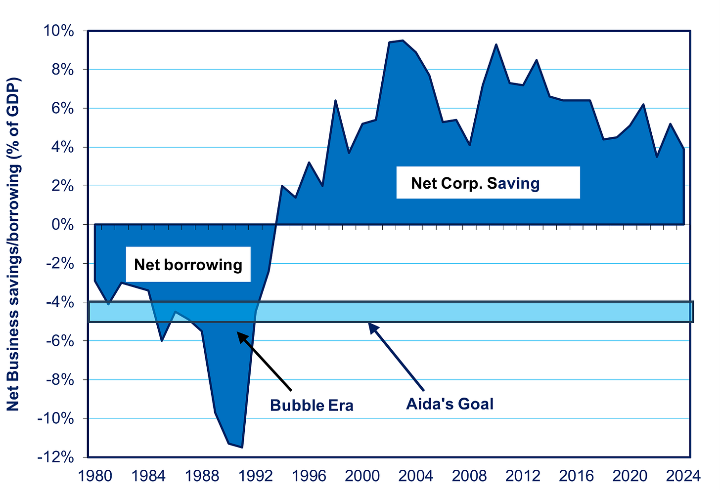 Pamberi pemakumi emakore akarasika, kudyara kwekambani mumidziyo uye R&D kwakapfuura kuyerera kwavo kwemari. Vaifanira kukwereta. Nhasi, makambani ane matani emari ekudyara zvakanyanya kupfuura zvavanoita, asi vanoona purofiti shoma mukuita kudaro. Mudzi wekuchengetedza makambani akawandisa ndewekuti kudzvanyirirwa kwemuhoro uye kuderedzwa kwemitero kwakawedzera zvakapetwa mari yemakambani kubva pasi pe8% yeGDP muna 1980 kusvika 16% muna 2025. Zvisineyi, Aida anoti chishamiso chekukurudzira kwemari uye 2% gap rekubuda richakurumidza kutanga kudyara.