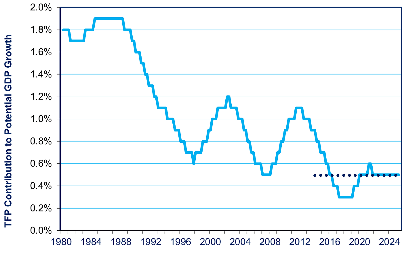 Muchokwadi, nekudzikira kwevashandi uye furati yekudyara, iyo yekutanga sosi yekukura kweGP ndeye Total Factor Productivity (TFP), iyo kukura kwayo kunoramba kudonha (ona chati pazasi). TFP inosanganisira kugadzirwa kwemari pamwe nekushanda; zvakadaro, Aida haana kana izwi pamusoro peizvi.